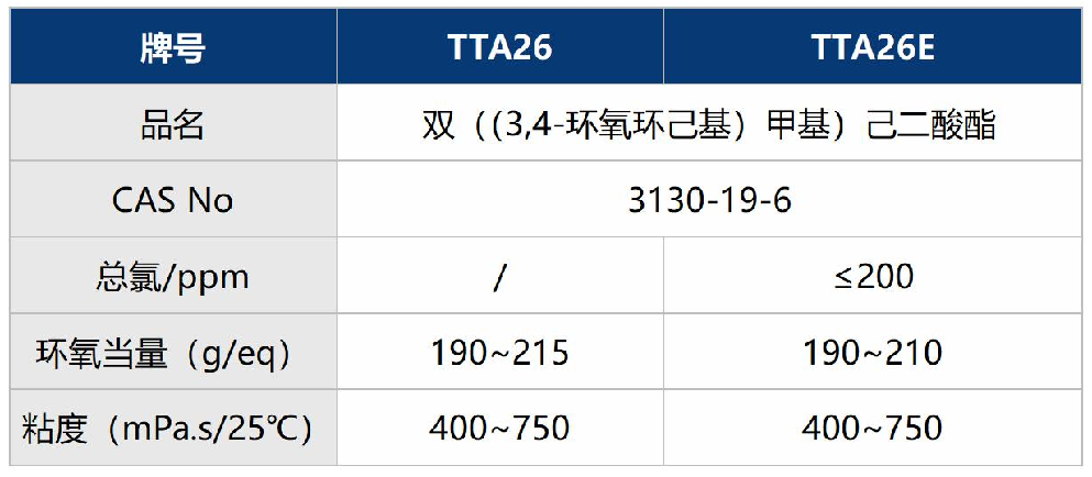 光固化3D打印成型材料為液體光敏樹脂,主要由預聚物樹脂、稀釋單體、光引發劑、助劑等組成。脂環族環氧樹脂因為具有低粘度、體積收縮率低、陽離子固化速度快的特點,被廣泛用于SLA型3D打印光敏樹脂中,代表性脂環族環氧樹脂為TTA21。韌性是3D打印材料評估中重要的指標之一,為了進一步改善3D打印材料的韌性,可選擇柔韌性的脂環族環氧樹脂,如TTA26,主要指標如下: