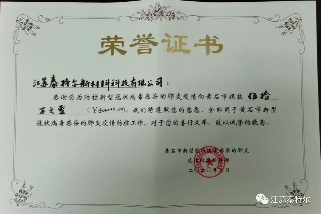 新型冠狀病毒肺炎爆發(fā),以武漢為中心迅速向周邊蔓延,目前疫情已蔓延至全國各省,面對這場突如其來的疫情,江蘇泰特爾新材料科技有限公司緊急決定向黃石市慈善總會捐贈人民幣50萬元,為防控疫情貢獻(xiàn)應(yīng)有之力。 同時為切實防止疫情擴(kuò)散蔓延,公司積極制定新型冠狀病毒肺炎防控工作方案,對防疫工作進(jìn)行全面安排和部...